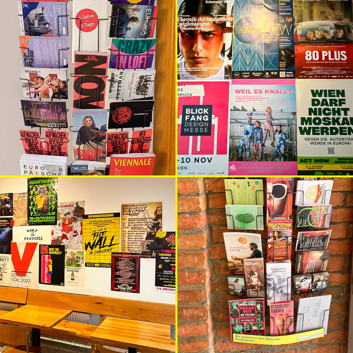 Wir verteilen Flyer und hängen Plakate gezielt in Cafés, Beisln, Bars, Programmkinos, Shops, Unis und kleinen Bühnen in Wien.